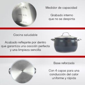 $3,699.00 El precio original era: $3,699.00.$3,400.00El precio actual es: $3,400.00.Contenido: 1 cazo, 2 cacerolas y 3 tapas (total de 6 piezas) Material: Acero inoxidable de alta calidad Tamaño: Cazo: 17 cm de diámetro y 10 cm de altura Cacerola pequeña: 21 cm de diámetro y 12 cm de altura Cacerola grande: 25 cm de diámetro y 14.5 cm de altura Capacidad: Cazo: 1.9L Cacerola pequeña: 3.8L Cacerola grande: 6.6L Color: Gris oscuro Fondo: Cápsula de cuádruple capa para una distribución rápida y uniforme del calor Instrucciones de cuidado: Lavar antes del primer uso con agua caliente y jabón suave, enjuagar y secar inmediatamente Funcionalidad: Ideal para una cocción eficiente y duradera, con excelente retención de calor.