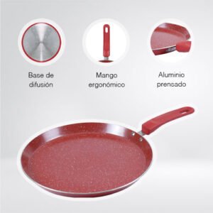 $449.00Contenido: – 1 crepera de 24 cm Material: Aluminio (2.5 mm) Color: Rojo con recubrimiento antiadherente ceramico azul de alta gama – Base antiderrapante con revestimiento exterior resistente al calor – Mango ergonomico – Compatible con estufa de gas Consideraciones generales: – Lavar con esponja suave – No utilizar fibras abrasivas – Evitar el choque termico – Utilice utensilios de silicon o nylon para evitar rayaduras – No es compatible con lavavajillas – No es compatible con horno de microondas