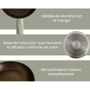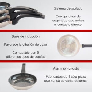 $2,399.00Contenido: 3 piezas (sartén de 20 cm, sartén de 24 cm y sartén de 28 cm). Material: Aluminio fundido con recubrimiento cerámico de alta gama. Color: Crema por fuera, negro por dentro. Sistema de apilado que previene rayones y ahorra espacio. Recubrimiento antiadherente cerámico de última generación. Base de inducción compatible con estufas eléctricas y de gas. Mangos suaves al tacto. No apto para lavavajillas ni horno de microondas. Recomendaciones: Secar bien antes de guardar, usar utensilios de silicón o nylon, y evitar el choque térmico.