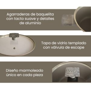 $2,399.00Material: Aluminio fundido con recubrimiento interno y externo de granito, tapa de vidrio templado con borde de silicón, protectores de agarradera de silicón. Capacidad: 7.5L, ideal para cocinar grandes cantidades de alimentos. Tamaño: Cacerola de 36 cm de diámetro y 8 cm de altura, protectores de silicón de 9×5 cm cada uno. Compatibilidad: Base de inducción, compatible con estufas de inducción y convencionales. Diseño: Color gris elegante, con tapa de vidrio para ver el contenido mientras cocinas. Seguridad: Agarraderas de silicón y protectores para un agarre cómodo y seguro. Fácil limpieza: El recubrimiento de granito evita que los alimentos se peguen, facilitando la limpieza.