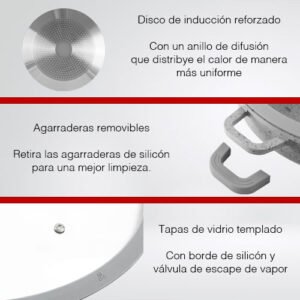 $3,499.00Contenido: 3 cacerolas (1.4 L, 2.5 L y 4.5 L), 3 tapas de vidrio templado con silicón, 1 agarradera desprendible. Material: Aluminio fundido, tapas de vidrio templado con silicón. Tamaño: Cacerola 1.4 L: 17.5 x 8.5 cm. Cacerola 2.5 L: 21 x 9 cm. Cacerola 4.5 L: 25.5 x 11.5 cm. Agarradera: 6.5 cm de diámetro y 4.8 cm de alto. Capacidad: 1.4 L, 2.5 L y 4.5 L. Color: Crema por fuera, negro por dentro. Base de inducción. Diseño apilable, previene rayones entre cacerolas. Sistema en las tapas para escurrir líquidos. Agarradera desprendible soporta hasta 18 kg.