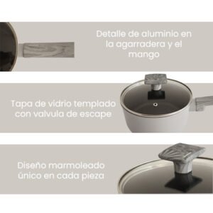 $3,099.00 El precio original era: $3,099.00.$2,800.00El precio actual es: $2,800.00.Contenido: 5 pzas – 1 cacerola con tapa de 24 cm y 4.2 Lt de capacidad (2 pzas) – 1 sarten de 20 cm – 1 sarten de 24 cm – 1 sarten de 26 cm Material: Aluminio y vidrio templado Color: Rosa y recubrimiento antiadherente ceramico gris – Con base de induccion difusora de calor – Mangos y agarraderas suaves al tacto antiderrapantes – Tapa de vidrio templado con valvula metalica para escape de vapor – Compatible con estufa de induccion, gas y electrica Consideraciones generales: – Lavar con esponja suave – No utilizar fibras abrasivas – Evitar el choque termico – Utilizar utensilios de silicon o nylon para evitar rayaduras – No es compatible con lavavajillas – No es compatible con horno de microondas