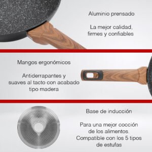 $749.00Contenido del set (1 pieza): 1 sartén de 24 cm de diámetro Material: Cuerpo: Aluminio forjado Mango: Baquelita con tacto suave Interior: Recubrimiento antiadherente Color: Gris y café Compatibilidad: Estufa de gas Estufa eléctrica Vitrocerámica Halógeno Inducción