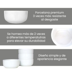 Contenido del producto: 4 tazones Total: 4 piezas Material: Porcelana de alta calidad Diámetro: 14 cm Capacidad: 680 ml Color: Blanco