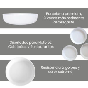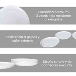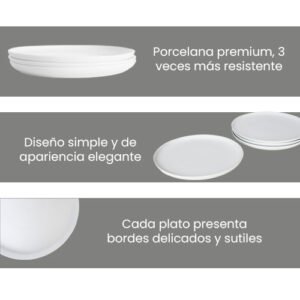 Contenido del producto: 4 platos trinche Total: 4 piezas Material: Porcelana de alta calidad Diámetro: 27 cm Color: Blanco