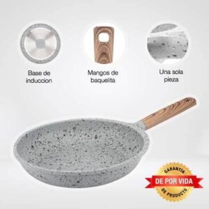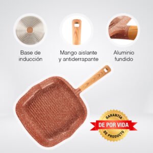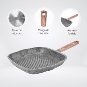$1,149.00Contenido: – 1 parrilla de 28 cm Material: Aluminio fundido fabricada en una sola pieza (4 mm) Color: Gris – Fabricado con 3 capas de recubrimiento antiadherente de granito y piedra volcanica de alta gama por dentro y por fuera – Antiadherente no toxico libre de PTFE y PFOA de larga duracion – Base de induccion de conduccion magnetica – Mango suave al tacto para un agarre comodo y seguro – Compatible con estufa de induccion, halogeno, gas y electrica – No se deforma Consideraciones generales: – Lavar con esponja suave – No utilizar fibras abrasivas – Evitar el choque termico – Utilizar utensilios de silicon o nylon para evitar rayaduras – Evitar que el fuego supere la base de induccion – No es compatible con lavavajillas – No es compatible con horno de microondas