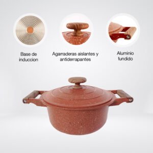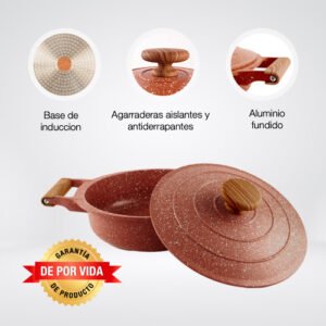$1,599.00Contenido: – 1 cacerola de 4.3 Lt de capacidad – 1 tapa Material: Aluminio fundido fabricados en una sola pieza (4 mm) Color: Anaranjado – Fabricados con 3 capas de recubrimiento antiadherente de granito y piedra volcanica de alta gama por dentro y por fuera – Antiadherente no toxico libre de PTFE y PFOA de larga duracion – Base de induccion de conduccion magnetica – Asas de baquelita suaves al tacto para un agarre comodo y seguro – Tecnologia antiescurrimiento en su tapa para evitar humedecer los alimentos – Compatible con estufa de induccion, halogeno, gas y electrica – No se deforma Consideraciones generales: – Lavar con esponja suave – No utilizar fibras abrasivas – Evitar el choque termico – Utilizar utensilios de silicon o nylon para evitar rayaduras – Evitar que el fuego supere la base de induccion – No es compatible con lavavajillas – No es compatible con horno de microondas