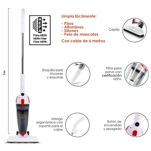 CONTENIDO: 1 PZ – ASPIRADORA 2 EN 1, (SE PUEDE USAR COMO ASPIRADORA VERTICAL Y DE MANO) MATERIAL PRINCIPAL: PLASTICO CAPACIDAD DEL COMPARTIMENTO PARA POLVO: 1.2L PESO NETO: 2.8 KG (AGARRADERA 1.3 KG Y TUBO 1.5 KG) FUNCION EN SECO – CUERPO LIGERO Y DE FACIL CONTROL – ES COMPACTA Y FACIL DE TRANSPORTAR – ES IDEAL PARA LIMPIAR LUGARES DE DIFICIL ACCESO, COMO RINCONES ESTRECHOS, ESCALERAS, MUEBLES – PERMITE REALIZAR LIMPIEZAS RAPIDAS Y PUNTUALES SIN TENER QUE SACAR LA ASPIRADORA DE TAMAÑO COMPLETO – ADECUADA PARA LA LIMPIEZA DE PISOS Y ALFOMBRAS CUENTA CON: – CABLE DE 6 METROS – FILTRO PARA POLVO CON CERTIFICACION HEPA – BOQUILLA PARA RINCONES Y ESQUINAS – CEPILLO – MANGO ERGONOMICO – BOTON DE ENCENDIDO Y APAGADO – CONTENEDOR DE POLVO EXTRAIBLE CONSIDERACIONES GENERALES – VACIAR EL RECIPIENTE DE POLVO DE MANERA FRECUENTE PARA EVITAR OBSTRUCCIONES Y MANTENER UN BUEN RENDIMIENTO DE SUCCION – LIMPIAR TAMBIEN LOS FILTROS DE ACUERDO CON LAS INSTRUCCIONES DEL FABRICANTE – GUARDAR LA ASPIRADORA EN UN LUGAR SECO Y LIBRE DE HUMEDAD PARA PREVENIR DAÑOS EN LOS COMPONENTES ELECTRONICOS. – ASEGURESE DE ENROLLAR CORRECTAMENTE EL CABLE Y GUARDAR LOS ACCESORIOS DE FORMA ORDENADA – EVITAR ASPIRAR LIQUIDOS – EVITAR ASPIRAR OBJETOS GRANDES, AFILADOS O QUE PUEDAN OBSTRUIR EL CONDUCTO DE SUCCION – MANTENIMIENTO REGULAR, COMO LIMPIAR LOS CEPILLOS Y ELIMINAR LOS ENREDOS DE PELO U OTROS OBJETOS ATRAPADOS – REVISA TAMBIEN LAS CONEXIONES Y LOS CABLES EN BUSCA DE POSIBLES DESGASTES
