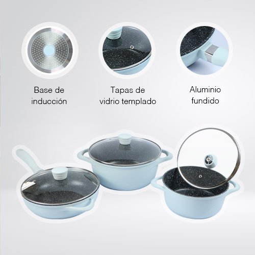 Material: Aluminio Fundido Incluye: 1 cacerola 20 cm con tapa 1 arrocera 24 cm con tapa 1 cacerola 26 cm con tapa