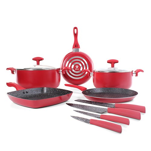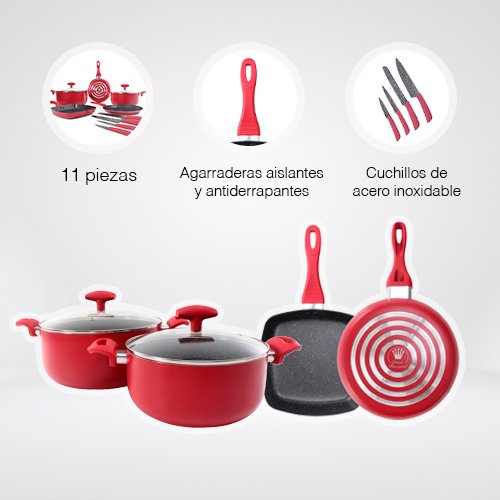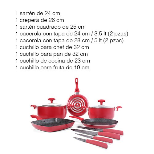 Contenido: 11 pzas – 1 cacerola de 28 cm y 5 Lt con tapa (2 pzas) – 1 cacerola de 24 cm 3.5 Lt con tapa (2 pzas) – 1 sarten cuadrado de 25 cm – 1 crepera de 26 cm – 1 sarten de 24 cm – 1 cuchillo para chef de 32 cm – 1 cuchillo para pan de 32 cm – 1 cuchillo de cocina de 23 cm – 1 cuchillo para fruta de 19 cm Material: Aluminio y vidrio templado Color: Rojo y recubrimiento antiadherente ceramico negro – Base difusora de calor – Mangos y agarraderas suaves al tacto, ergonomicos y antiderrapantes – Tapas de vidrio templado con valvula metalica para escape de vapor – Compatible con estufa de gas y electrica Consideraciones generales: – Lavar con esponja suave – No utilizar fibras abrasivas – Evitar el choque termico – Utilizar utensilios de silicon o nylon para evitar rayaduras – No es compatible con lavavajillas – No es compatible con horno de microondas