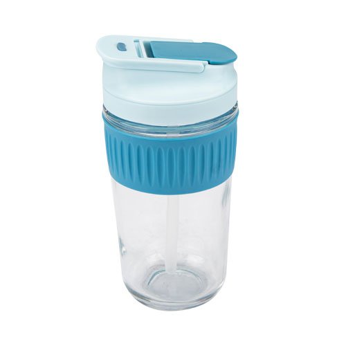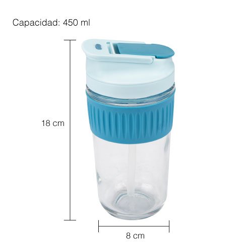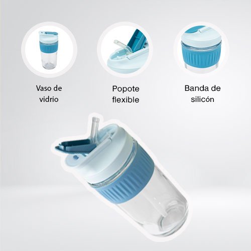 Materiales: Cuerpo de Vidrio, Funda de Silicona y Tapa de Plástico Grado Alimenticio (BPA Free).
