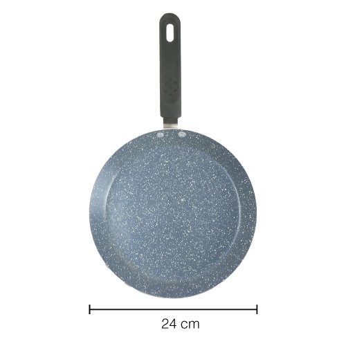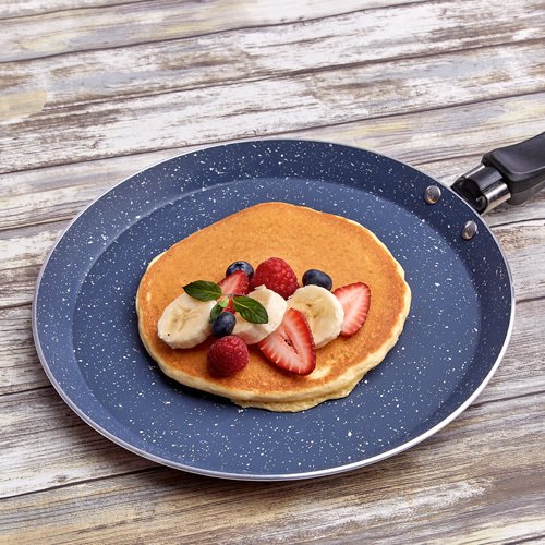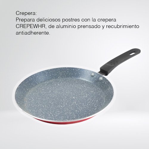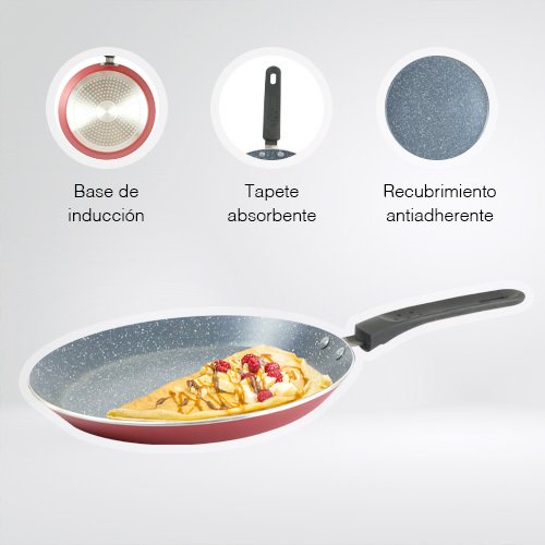 Contenido: – 1 crepera de 24 cm Material: Aluminio (2.5 mm) Color: Rojo con recubrimiento antiadherente ceramico azul de alta gama – Base antiderrapante con revestimiento exterior resistente al calor – Mango ergonomico – Compatible con estufa de gas Consideraciones generales: – Lavar con esponja suave – No utilizar fibras abrasivas – Evitar el choque termico – Utilice utensilios de silicon o nylon para evitar rayaduras – No es compatible con lavavajillas – No es compatible con horno de microondas