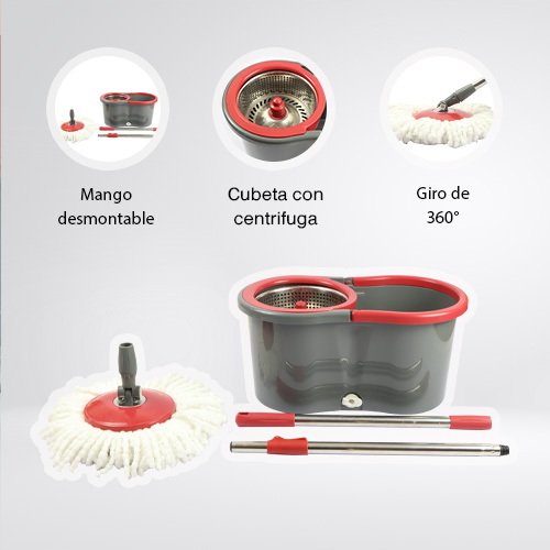 La combinación de plástico resistente y acero inoxidable garantiza que este sistema de limpieza sea duradero, manteniéndose funcional incluso después de un uso prolongado. Su diseño moderno y compacto lo hace ideal para cualquier hogar, ya que puedes almacenarlo fácilmente sin ocupar demasiado espacio. Además, el sistema de rotación en el trapeador permite maniobrar con precisión hasta en las esquinas más estrechas, brindando una limpieza completa y eficiente.