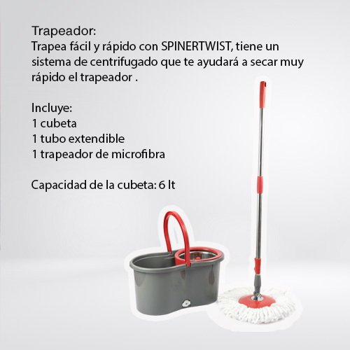 Este producto es la opción ideal para quienes buscan optimizar su tiempo mientras logran resultados impecables. Su tecnología intuitiva de exprimidor y el giro de alto rendimiento del trapeador la convierten en una herramienta indispensable en tareas de limpieza. Ya sea para suelos delicados o superficies resistentes, la Spinertwist Cubeta Exprimidora asegura resultados excepcionales. Facilita tu rutina y experimenta cómo una única inversión eleva tu calidad de vida y ahorra tiempo.