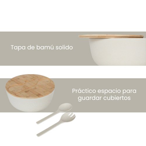 Descubre la ensaladera de fibra de bambú con tapa y cubiertos integrados, un producto diseñado para brindar comodidad, estilo y sostenibilidad en tu día a día. Perfecta para quienes buscan soluciones funcionales y respetuosas con el medio ambiente, esta ensaladera combina elegancia y practicidad en un solo elemento.