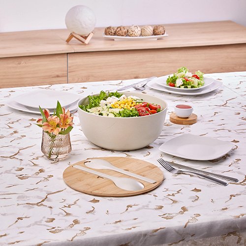 Fabricada con fibra de bambú, esta ensaladera destaca por su compromiso con la sostenibilidad. El bambú es un material renovable y biodegradable, lo que convierte a este producto en una opción ecológica que aporta al cuidado del medio ambiente. Además, su diseño natural y minimalista se adapta fácilmente a cualquier tipo de cocina, añadiendo un toque orgánico y moderno.