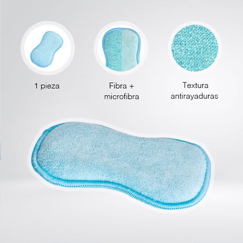 Esponja: Limpia de forma suave las superficies antiadherentes -Elimina fácilmente suciedad y grasa Fibra -Retira los residuos de tus ollas y sartenes – No daña ni raya
