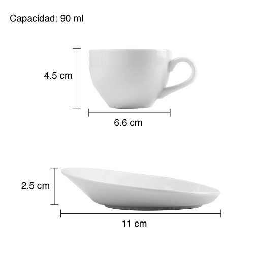 Contenido: 2 tazas y 2 platos (4 piezas en total). Material: Porcelana de alta calidad. Tamaño: Taza de 8.8 x 6.6 x 4.5 cm; Plato de 11 x 11 x 2.5 cm. Capacidad: 90 ml por taza. Diseño: Blanco, elegante y minimalista. Ideal para: Espresso, infusiones y pequeños bocadillos. Perfecto para añadir un toque de elegancia a tu rutina diaria o para momentos especiales.
