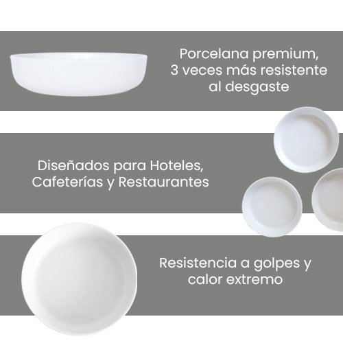 Su diseño profundo y elegante ofrece una excelente capacidad para servir sopas, cremas o guisos. El delicado tono blanco de los platos ha sido cuidadosamente seleccionado para resaltar los colores vibrantes y texturas de tus preparaciones culinarias, convirtiendo cada comida en una experiencia visual y gustativa.