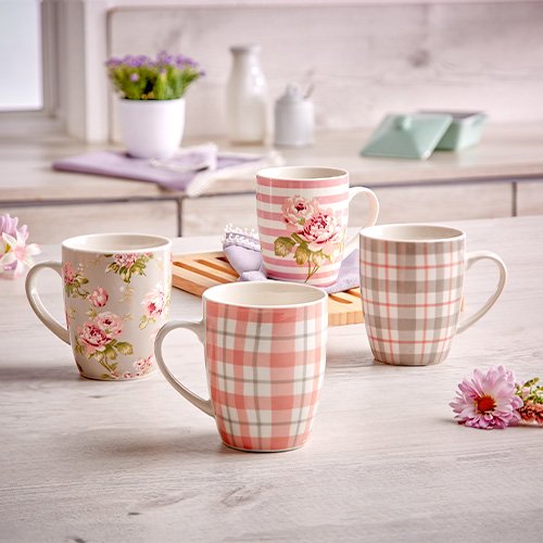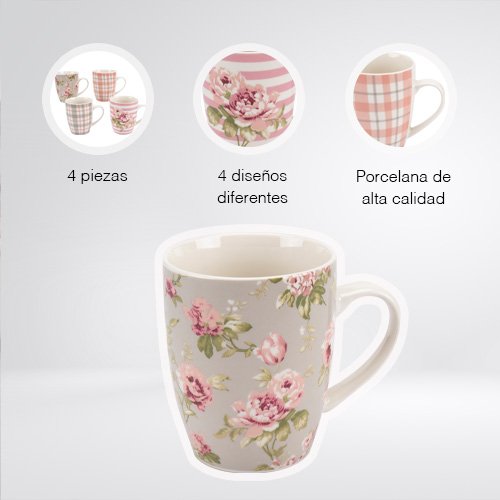 JUEGO DE 4 TAZAS DE PORCELANA DE 350 ML CON DISENOS PASTELES