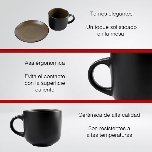Contenido: 4 tazas y 4 platos para postre, total de 8 piezas. Material: Cerámica de alta calidad, resistente y duradera. Tamaño: Platos para postre de 16.6 cm de diámetro Tazas de 9 cm de diámetro y 8.7 cm de alto Capacidad: 320 ml por taza, ideal para bebidas o postres. Diseño: Elegante combinación de colores café y negro, que aporta un toque moderno y sofisticado a tu mesa. Versatilidad: Ideal para disfrutar de postres, cafés o cualquier bebida caliente. Uso diario o especial: Perfecto para ocasiones cotidianas o eventos especiales, brindando estilo y funcionalidad.