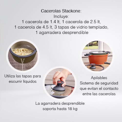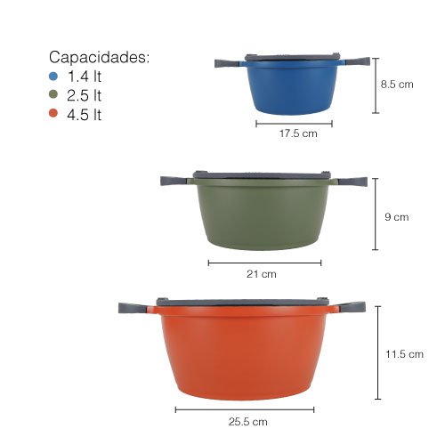 Set de 3 cacerolas apilables con tapa de vidrio templado 1 agarradera desprendible soporta hasta 18 kg Cacerola anaranjada: Capacidad: 4.5 litros Base: 25.5 Altura: 11.5 cm Cacerola verde: Capacidad: 2.5 litros Base: 21 cm Altura: 9 cm Cacerola azul: Capacidad: 1.4 litros Base: 17.5 cm Altura: 8.5 cm