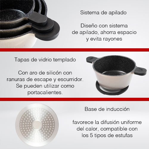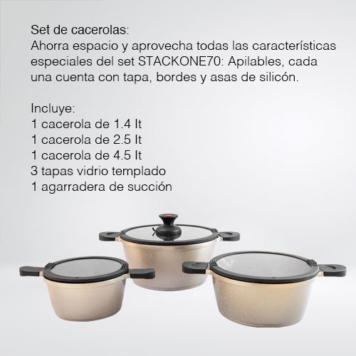 Contenido: 3 cacerolas (1.4 L, 2.5 L y 4.5 L), 3 tapas de vidrio templado con silicón, 1 agarradera desprendible. Material: Aluminio fundido, tapas de vidrio templado con silicón. Tamaño: Cacerola 1.4 L: 17.5 x 8.5 cm. Cacerola 2.5 L: 21 x 9 cm. Cacerola 4.5 L: 25.5 x 11.5 cm. Agarradera: 6.5 cm de diámetro y 4.8 cm de alto. Capacidad: 1.4 L, 2.5 L y 4.5 L. Color: Crema por fuera, negro por dentro. Base de inducción. Diseño apilable, previene rayones entre cacerolas. Sistema en las tapas para escurrir líquidos. Agarradera desprendible soporta hasta 18 kg.