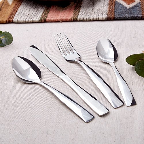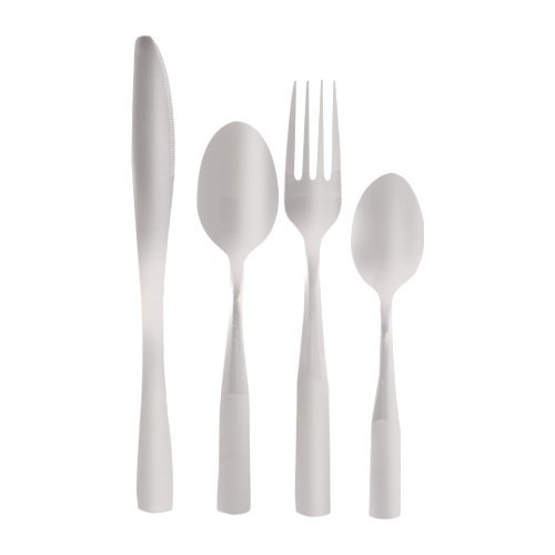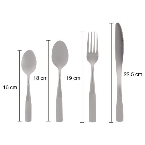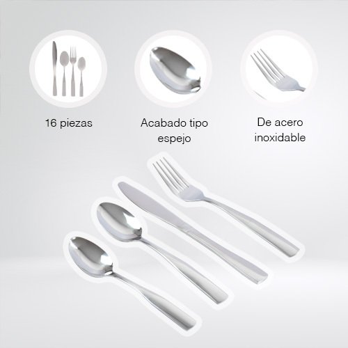 Incluye: 4 cucharas soperas 4 cucharas cafeteras 4 tenedores de mesa 4 cuchillos de mesa Material: acero inoxidable
