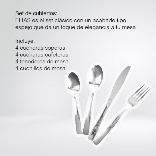 ELIAS es más que un simple set de cubiertos; es una declaración de estilo y calidad para tu mesa. Ideal para 4 personas, estos cubiertos de acero inoxidable combinan elegancia moderna y funcionalidad práctica. Su diseño limpio y sofisticado los convierte en una opción perfecta para cualquier ocasión, ya sea el uso diario o esas cenas especiales en las que quieres impresionar.