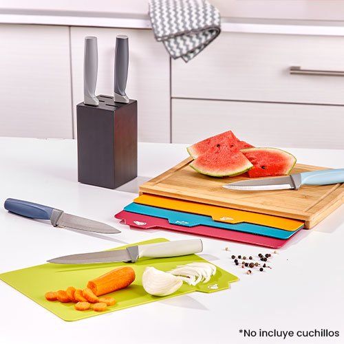 Incluye: 1 tabla de bambú 1 tabla para carne 1 tabla para pollo 1 tabla para pescado 1 tabla para frutas y vegetales Medida de tablas: 28 x 24 cm Medida tabla estuche: 30 x 32 x 2 cm