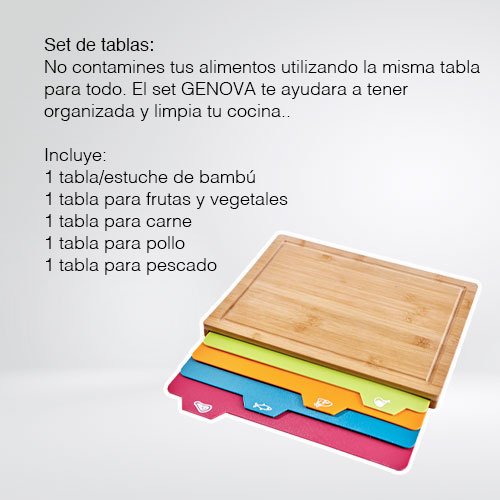GENOVA es la solución perfecta para quienes buscan combinar funcionalidad y estilo en la cocina. Este innovador set incluye una elegante tabla de bambú y cuatro tablas de corte de plástico resistentes, ideales para mantener los sabores separados mientras preparas tus alimentos. Olvídate del desorden y disfruta de una cocina organizada gracias a su diseño compacto y práctico, que incluye un estuche con compartimentos para mantener todas las tablas en un solo lugar.