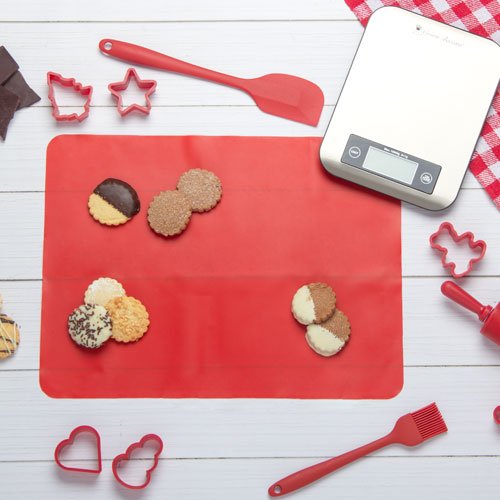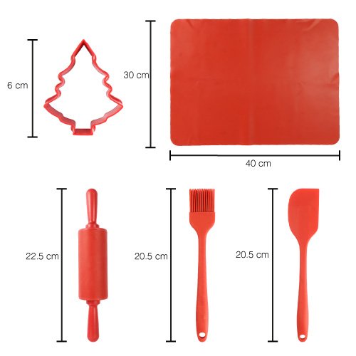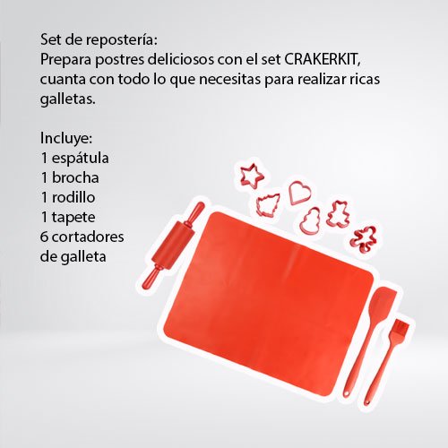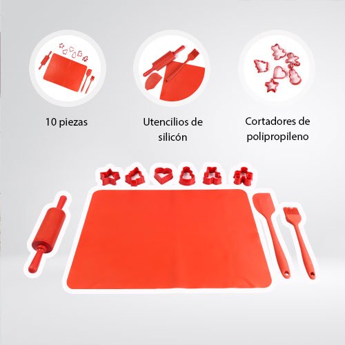Contenido: 10 pzas – 1 espatula – 1 brocha – 1 rodillo – 1 tapete de 40 x 30 cm – 6 cortadores de galletas Material: Silicon Color: Rojo – Gozan de excelente capacidad antiadherente – Resistentes al calor sin deformarse – No desprenden sustancias toxicas – Flexibles y durables – Versatiles y de larga vida util – Faciles de limpiar Consideraciones generales: – Aptos para lavavajillas – Evitar el uso de utensilios cortantes que puedan estropear la superficie – No lavar con estropajos abrasivos o productos quimicos agresivos – Es recomendable lavarlos de forma manual con agua tibia y detergente suave – Evitar someter los utensilios a temperaturas excesivamente altas – Guardarlos en un lugar seco y protegido
