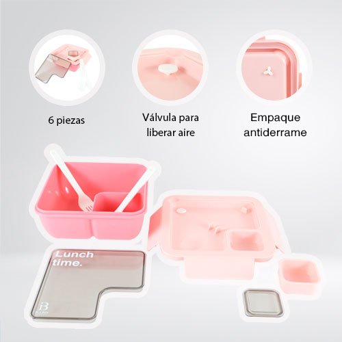Contenido: 6 piezas (Contenedor, tapa con broche, tapa transparente, contenedor interno, cuchara y tenedor).