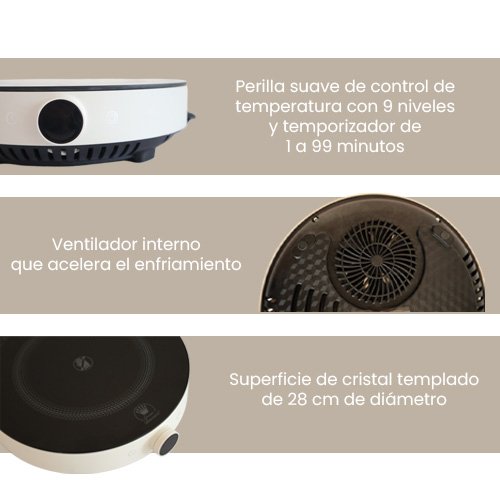 Cocina con precisión y estilo retro. Parrilla eléctrica de cristal templado compatible con todas tus ollas. 9 niveles de potencia, temporizador y diseño compacto marfil.