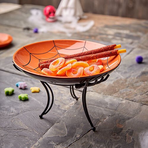 Candyarana se distingue por su cuidado diseño que combina estilo y durabilidad. El platón presenta una textura cerámica en un tono naranja encantador, mientras que el resistente rack de metal en color negro complementa a la perfección el tema espeluznante. Cada detalle ha sido minuciosamente elaborado, asegurando que este accesorio no solo embellezca tu evento sino que soporte el uso constante con una estructura robusta y fiable.