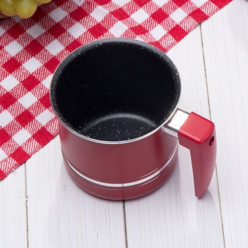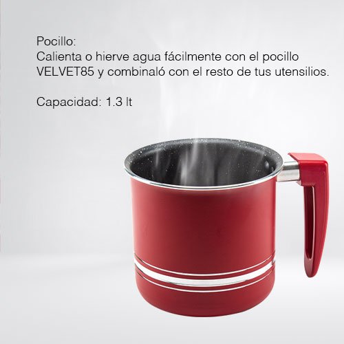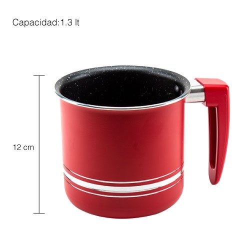 Contenido: – 1 pocillo de 12 cm y capacidad de 1.3 Lt Material: Aluminio Color: rojo Caracteristicas: – Mango ergonomico – Su comodidad en formas facilita su manejo y evita derrames accidentales – Compatible con estufa de gas – Su capacidad permite disfrutar de porciones generosas sin excederse – Hecho de material resistente Consideraciones generales: – Lavar con esponja suave – No utilizar fibras abrasivas – Evitar el choque termico – Utilizar utensilios de silicon o nylon para evitar rayaduras – No es compatible con lavavajillas – No es compatible con horno de microondas