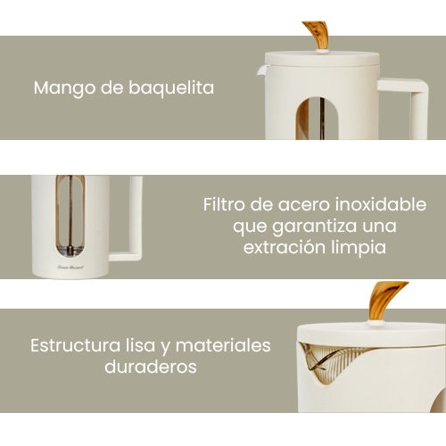 Fabricada con vidrio resistente y filtro de acero inoxidable, esta prensa francesa no solo asegura durabilidad, sino que también es amigable con el medio ambiente. El vidrio permite una visualización clara durante el proceso de preparación, mientras que el filtro asegura una extracción precisa sin residuos. Este diseño elegante combina funcionalidad y estilo para complementar cualquier cocina moderna.