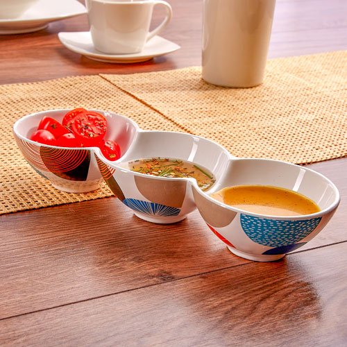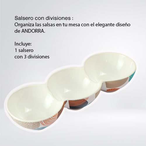 Con sus tres divisiones perfectamente separadas, este salsero permite mantener los sabores organizados y sin mezclas no deseadas. Sirve guacamoles, dips, cremas, o cualquier tipo de acompañamiento con total comodidad y eficiencia. Su tamaño de 25 cm ofrece la capacidad suficiente para adaptarse a diversas recetas, mientras que su construcción duradera garantiza que soportará un uso frecuente.