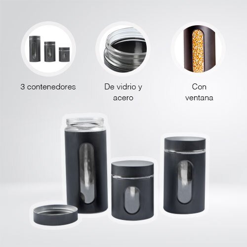 Set de 3 Contenedores NERO3 | Vidrio, Acero Inoxidable y Tapa de Rosca
