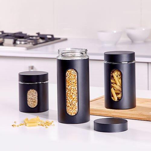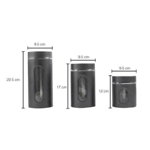 Organiza con elegancia con el set NERO3. 3 frascos de vidrio y acero inoxidable negro (600ml a 1.27L). Tapas herméticas de rosca para máxima frescura.