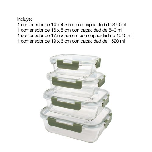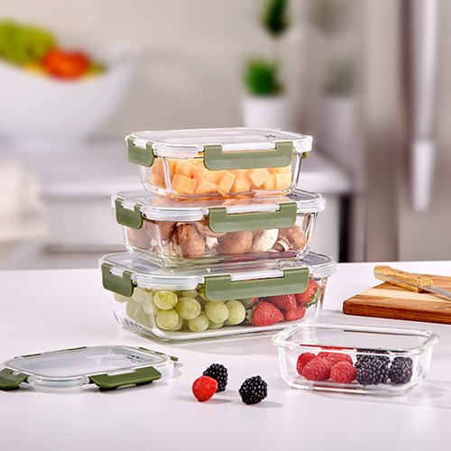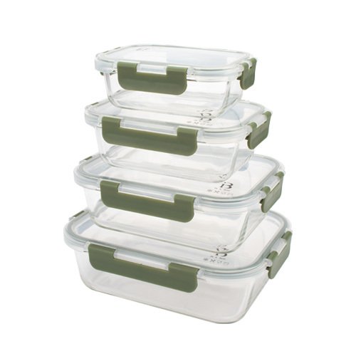 Optimiza tu cocina con el OriolSET. 4 recipientes de vidrio con tapas herméticas verde olivo. Aptos para microondas, lavavajillas y libres de BPA. ¡Compra orden y frescura!