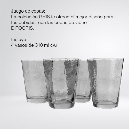 El set de vasos DITOGRIS1 es una adición esencial para cualquier hogar que valore la combinación de estilo y funcionalidad. Su resistencia y elegancia aseguran que no solo sean prácticos, sino también un detalle decorativo que resalte en tus momentos especiales. Ya sea para el uso diario o para ocasiones especiales, estos vasos tienen todo lo que necesitas.