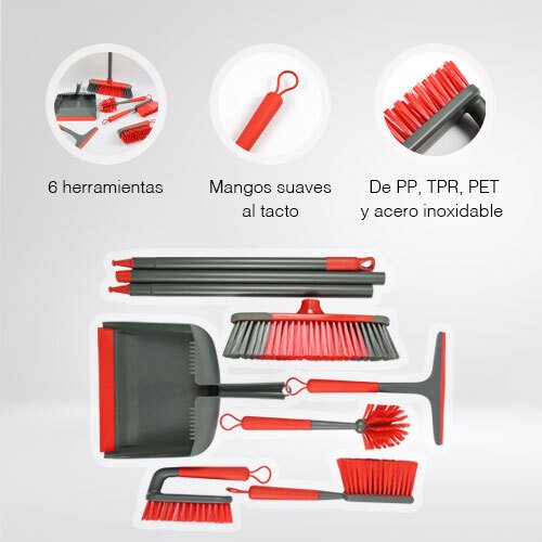 Kit completo para un hogar impecable. Incluye escoba de 126cm, cepillo para platos, recogedor, cepillo para tallar y enjuagador. Calidad profesional para menos esfuerzo.