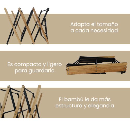 Detalles en Bambú Natural: El bambú no solo aporta un toque fresco y moderno, sino que es naturalmente resistente a la humedad, lo que garantiza que tu tendedero mantenga su belleza con el paso del tiempo.