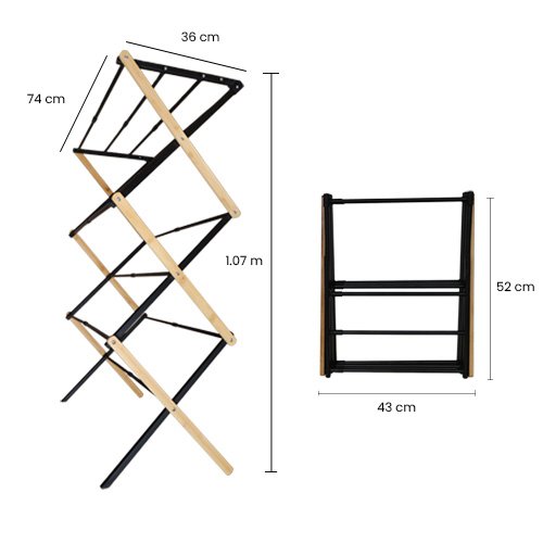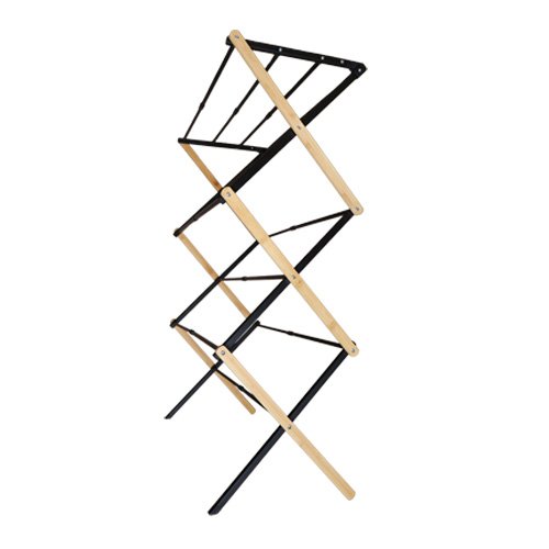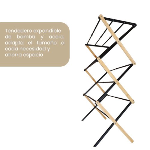 Optimiza tu espacio con estilo. Tendedero vertical expandible (hasta 74cm) fabricado en acero negro y bambú natural. Resistente, compacto y de secado eficiente.