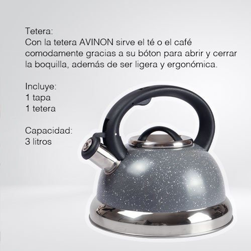 No importa si prefieres un té relajante para tus mañanas o disfrutar de una ceremonia del té sofisticada, la tetera modelo AVINON se convierte en una pieza imprescindible para tu hogar. Su diseño versátil y funcional combina perfectamente con diferentes estilos de decoración, aportando valor al espacio en el que se ubique. Ahora puedes disfrutar de tu té favorito con máxima comodidad y estilo.