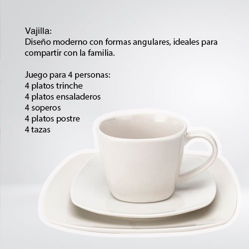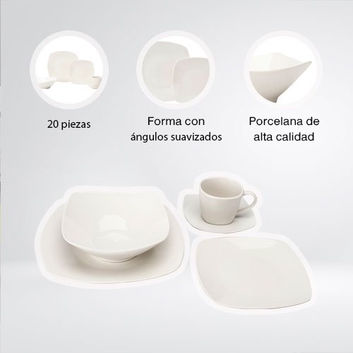 VAJILLA CUADRADA DE PORCELANA PARA 4 PERSONAS DE 20 PIEZAS