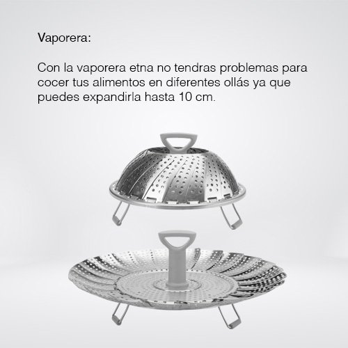 Una de las principales ventajas de Etna es su capacidad de ajuste inteligente. Con un diámetro que se expande entre los 18 y 28 cm, esta vaporera es perfectamente adaptable a cualquier olla o sartén. Ya sea que estés preparando una comida rápida o una cena elaborada para tus seres queridos, Etna se ajustará a tus necesidades sin inconvenientes. Su mecanismo expandible ofrece una experiencia culinaria cómoda y versátil, convirtiéndola en la opción ideal para cocinas de todos los tamaños.